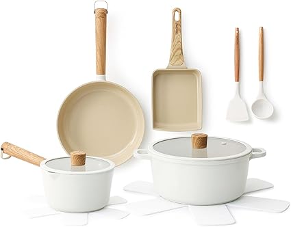 ・12点セットに含まれる内容物:フライパン24cm、両手鍋24cm、片手鍋18cm、卵焼きフライパン(専用フライ返し付き)、お玉*フライ返し セット、収納用鍋敷き*3枚。本セットには寿喜鍋のプレゼントも含まれています。(実用的な組み合わせで、2〜4人家族用に最適 。