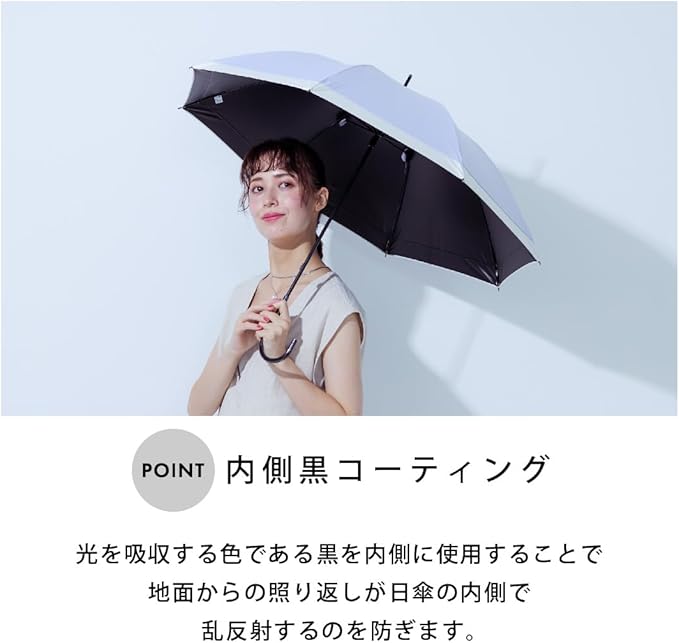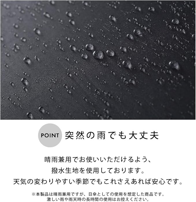 ・【毎日使える晴雨兼用日傘】この製品は、紫外線遮蔽・遮光・遮熱効果を目的とした日傘です。また、生地にはPUコーティングを施しているため防水効果が見込め、雨の日にもご使用いただけます。