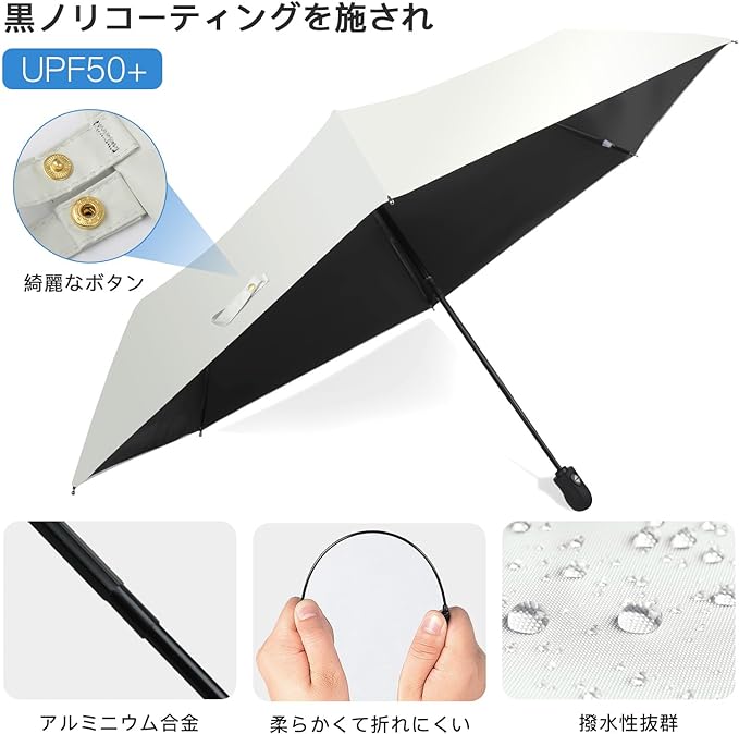 【完全遮光&日焼け止め】この超軽量日傘は高密度生地に多層黒ノリコーティングを施しており、UPF50+、UVカット率100%、完全遮光、効果的に日焼け止めできます。肌を日差しや有害紫外線からしっかり守り、日焼け防止、熱中症対策にも役立ちます。日傘として常備しておけば、猛暑でも安心に出かけます。