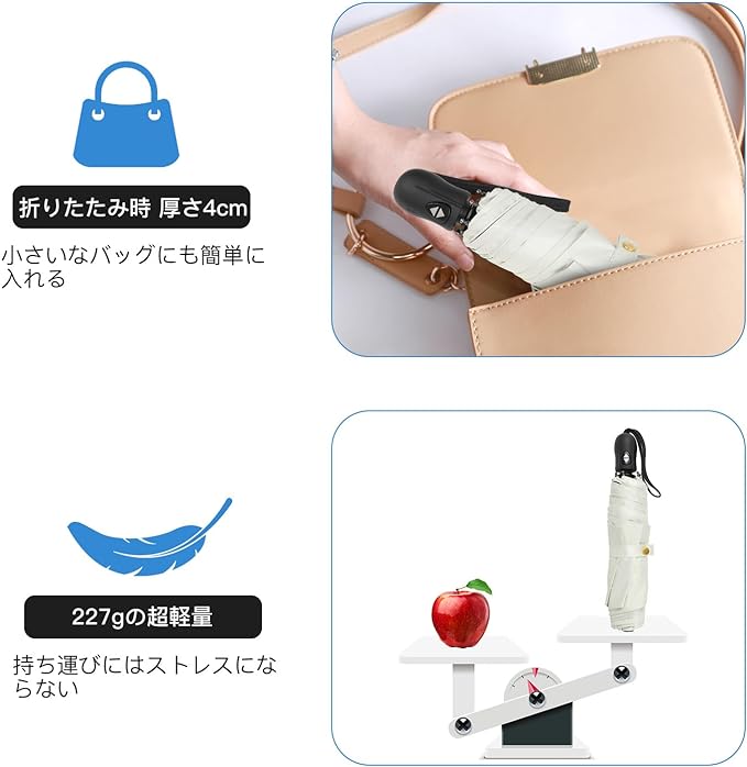 【超軽量&携帯便利】この折りたたみ日傘は柄のない無地デザインで、どんなスタイルにも合わせやすいので、レディース用はもちろん、男性がメンズ日傘として使っても違和感はありません。折りたたんだ厚さはわずか4cm、長さは26cm、重さは約227g、とても小さくて軽い日傘です。バッグに簡単に入れることができ、通学、通勤、遠足、旅行,出張など幅広くご利用できます。