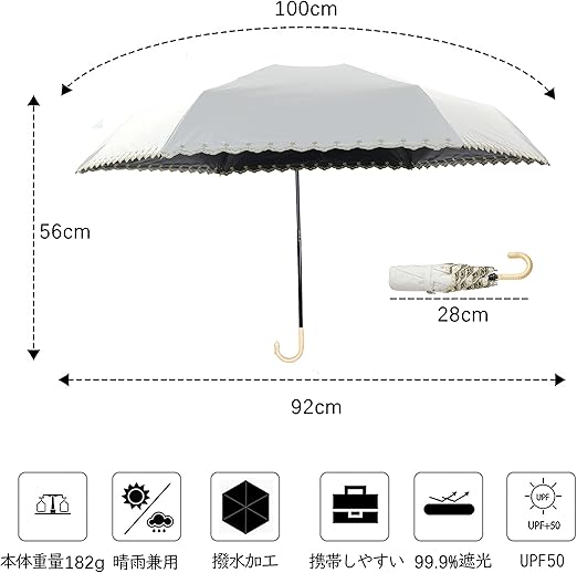 ・☆【サイズ 】[親骨の長さ]約50cm [直径]約92cm [収納時の長さ]長さ:約28cm 本体重量:約182g 遮光率:99.9% UV遮蔽率:99.9% UPF評価:UPF50+ ※各サイズ/重量は製品によって多少の誤差がある場合があります。