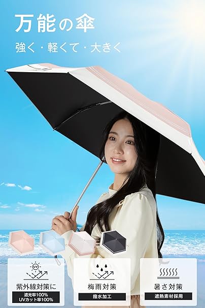 ・【100%紫外線遮蔽 &-16℃の遮熱効果】JIS規格試験で遮光率100%・UVカット率は全色100%、UPF50+(国内第三者検査機関による確認済み)!日焼けを防ぐために必要なUVカットの性能を兼ね揃えた、紫外線対策にはピッタリの折りたたみ日傘です。さらに涼しく過ごすための遮熱性も重視、断熱素材「酸化チタン」を練り込んだ素材を使用しています。開いたら、傘下温度の上昇を抑え、最大-16℃の遮熱効果を実現しました 暑い夏の熱中症対策にもぜひおすすめ!