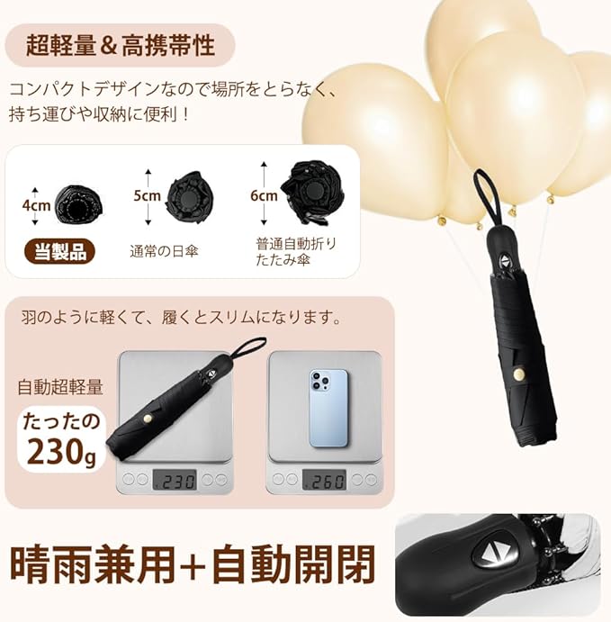 ・【超軽量*携帯便利】最新デザインの 折りたたみ日傘 が登場!超軽量でスリムにこだわったデザインで、カバンに簡単に入れることができます。折りたたんだ時の厚さはわずか4cm、長さは25cm、重さは約230gです。超コンパクトボディ で普段使いにも持ち歩くときにも収納にも便利!全天候対応で悪天候も晴天も使えます。男女兼用ワンタッチ 自動開閉折り畳み傘。通学、通勤、遠足、旅行、出張など様々の場合がご利用できます。