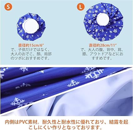 ・【冷温両用のアイスバッグ】アイスバッグのサイズ(Sサイズ:直径約15cm 、Mサイズ:直径約23cm、Lサイズ:直径約28cm)。冷感を使う場合は、氷嚢に氷と水を3分の2ほど入れます。(★注意:氷を追加する際、室温との差が大きいと結露が発生する場合があります。タオルなどで包むことをお勧めします。温熱用法の場合は、氷嚢に温水を3分の2ほど入れます。(★注意:水の温度は50-60℃/ 122?-140?です)