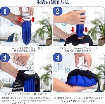 ・【冷温両用】冷感用法の場合は、アイスバッグに氷と水を3分の2入れて。(★注意:氷を追加した場合、室温との差が大きいと結露が発生する場合があります。タオルなどで包むことをお勧めします。)温熱用法の場合は、氷嚢に温水を入れて。 (★注意:温水用法の温度は50-60℃/ 122?-140?です)