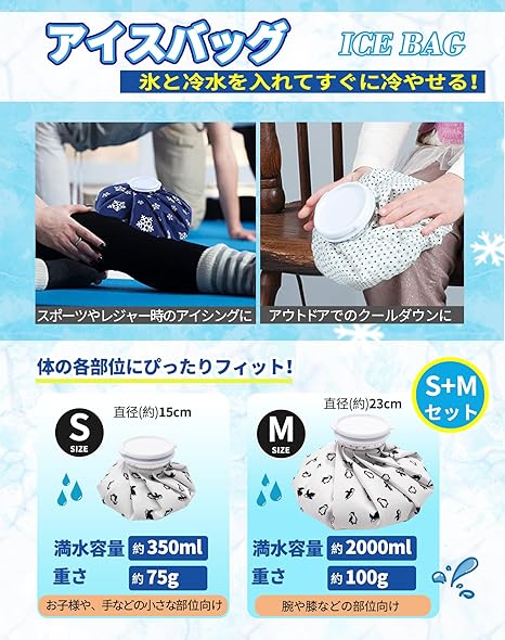 ・【S+Mセット・氷嚢】・Sサイズ氷嚢*1 (S-6inch/Φ15.0cm/350ml/75g) ・Mサイズ氷嚢*1 (M-9inch/Φ23.0cm/2000ml/100g) ★2way用途 Way1:氷のうでクールダウン。Way2:お湯を入れてホットバッグとして利用可能(60℃まで)表地:ポリエステル100% 裏地:PVCポリ塩化ビニル キャップ:ABS樹脂 パッキン:シリコーンゴム 口金:ポリプロピレン・アルミニウム ※氷嚢に少し塩を加えると、冷却時間が少し長くすることができます。