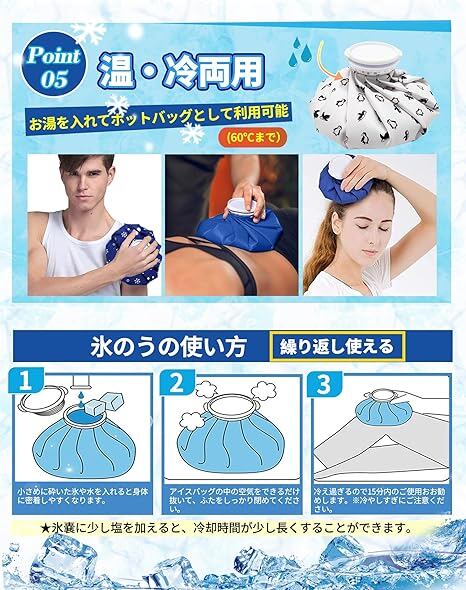 ・【アイシングとホットバッグ】アイスバッグ(氷のう)は、氷と冷水で簡単にアイシング(冷やす)が出来るアイスバッグ、スポーツのクールダウン。体の各部位にぴったりフィットし手軽に冷やせます。アイシングのみならず、お湯を入れて、疲労部位・冷えた患部の温熱ケアにホットバックとして利用可能(60℃まで)です。