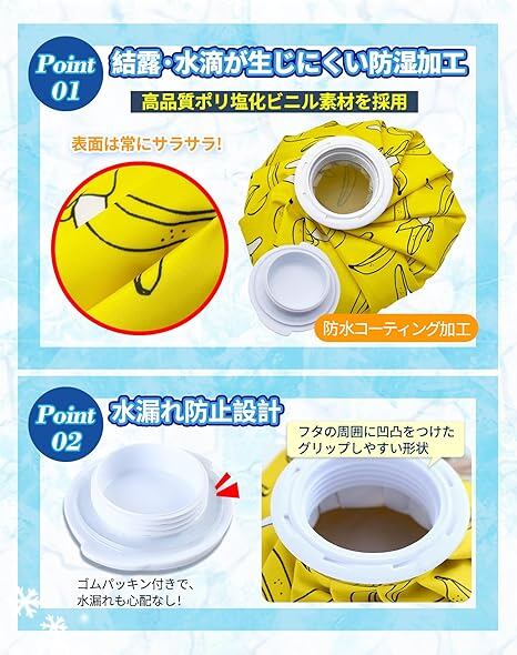 ・【結露?水滴が生じにくい防湿加工】最新の高技術採用、アイスバッグの裏に高品質ポリ塩化ビニル素材を採用、表に結露&水滴が生じにくく防湿で、シリコン製のリングを採用したキャップで水漏れもなくて、楽しく使えます。※室内室外の温度差が大きいときに使う場合は、水と氷の割合を1対1にすると良いとアドバイスしています(タオルなどで包んで使用することをおすすめします)。
