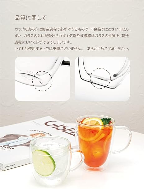 ・【ダブルウォールグラス】ガラスが二重構造なので、冷たくても熱くてもそれぞれの温度を保ち保温性に優れており、熱い淹れたての飲み物も抵抗なく手にすることができます、また氷の入った冷たい飲み物の表面にも結露が付きにくいので、オフィスやテレワークなどデスクの上の大切な書類を汚すことが無く安心です。