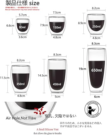 ☆防疫対策:出荷前にコップごとに高温消毒処理を行い、包装物の表面にアルコール消毒液をかけて消毒する。安心して使ってください。 二層コーヒーカップは、ホウケイ酸ガラスを使用して専門の技術者によって作られています。ホウケイ酸ガラスは、従来の「ソーダライム」ガラスよりも強度が高く、飲料器具から調理器具まであらゆるものに使用できます。 ホウ素粒子の自然な特性により、ガラスはしっかりと固定され、より強く、より軽いガラスになります。 ホウケイ酸ガラスは、酸化ホウ素の接合性により、従来のガラスほど厚くする必要がなく、強度も高いです。
