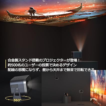 ・【金属製スタンド搭載、天井投影プロジェクター】ご存知ですか?小型プロジェクターを一定期間使用した後、追加でスタンドを購入する方は85%もいらっしゃるんです(2024.2当社調べ)。市場に多く出回っているプラスチック製のスタンドとは異なり、VB6プロジェクタースタンドは高強度の合金材料を使用しており、表面は磨砂仕上げされていますので、プラスチックの突起を心配する必要はありません。デザイン性がありつつも、長期間使用しても変形しにくい特性があります。家庭用プロジェクターは夜間によく使用されるため、回転時の静音性には特に配慮しています。回転中にプラスチック製スタンドのようなカチカチ音がしません。検査データによると、93%は「金属製でいい」との声をいただいています。安定性はプラスチック製よりも30%高く、投影時にスタンドの揺れ問題もなくなる!設置場所の制約、機器とスタンドの重量や互換性の制約を受けられず、天井投影を存分にお楽しみいただける!【今ご注文いただくと、100インチスクリーンやプロジェクター台がもらえるチャンス!詳しくは取説のお問合せ先まで】