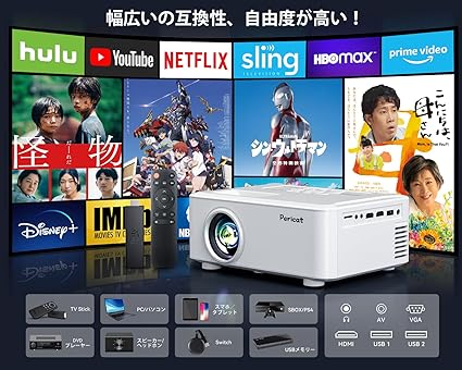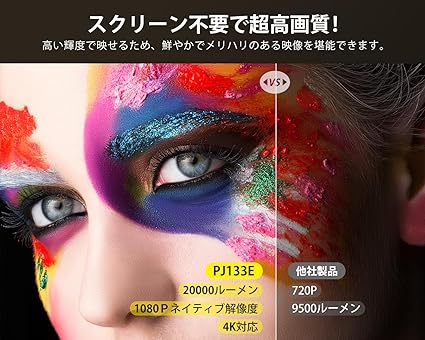 ・【新生代技術&コスパ最強!20000ルーメン&1080P&4K対応】プロジェクター「PJ133E」は業界最先端の技術により、4色のLEDを光源に採用し映画向けの色域を99%カバーし、20000ルーメンの明るさで圧倒的な映像美を実現します。独自の「ディスプレイ技術」と「プロジェクション技術」を極め、生活のあらゆる場面で感動の映像体験と快適なホームシアター環境を創造し続けます。●ネイティブ解像度を1920*1080にアップグレードし、リアル1080PフルHD対応可能です。さらに、PericatのHDR-PRO技術により、明るい風景でも暗い風景でも、シーンごとの微妙な変化を表現でき、光の加減に合わせた微妙な変化を再現します。同価格帯のプロジェクターと比べると、画質が2.35倍も向上し、明るさと鮮明さ両方もより良いです。●4Kソースが対応、日中の視聴や明るい部屋での投写も可能です。友人や家族と、映画鑑賞や、スポーツ観戦を存分にお楽しみいただけます。●【限定期間キャンペーン】壁掛けスクリーン/360°回転スタンドゲット可能!お気軽に説明書の連絡先より弊社までご応募してください!