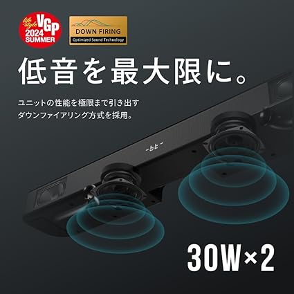 ・【商品仕様】(本体)サイズ:幅61.0cm×奥行10.0cm×高さ6.2cm / 重量:約 2.3kg / 出力:総合100W(20W×2ツィーター&30W×2ウーファー) / Bluetoothバージョン:5.0