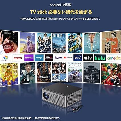 ・【大画面がよりスマートに!Android TVが新登場!】WOTNISYプロジェクターはアンドロイド9.0搭載されており、Amazon Prime VideoやYouTube、Netflix、Hulu、Abema TVなどアプリを通じて、お好きなコンテンツを利用できます。さらに、5,000以上のアプリは直接に本体のApps storeからインストールすることができます。※一部インストールできないアプリがございます。