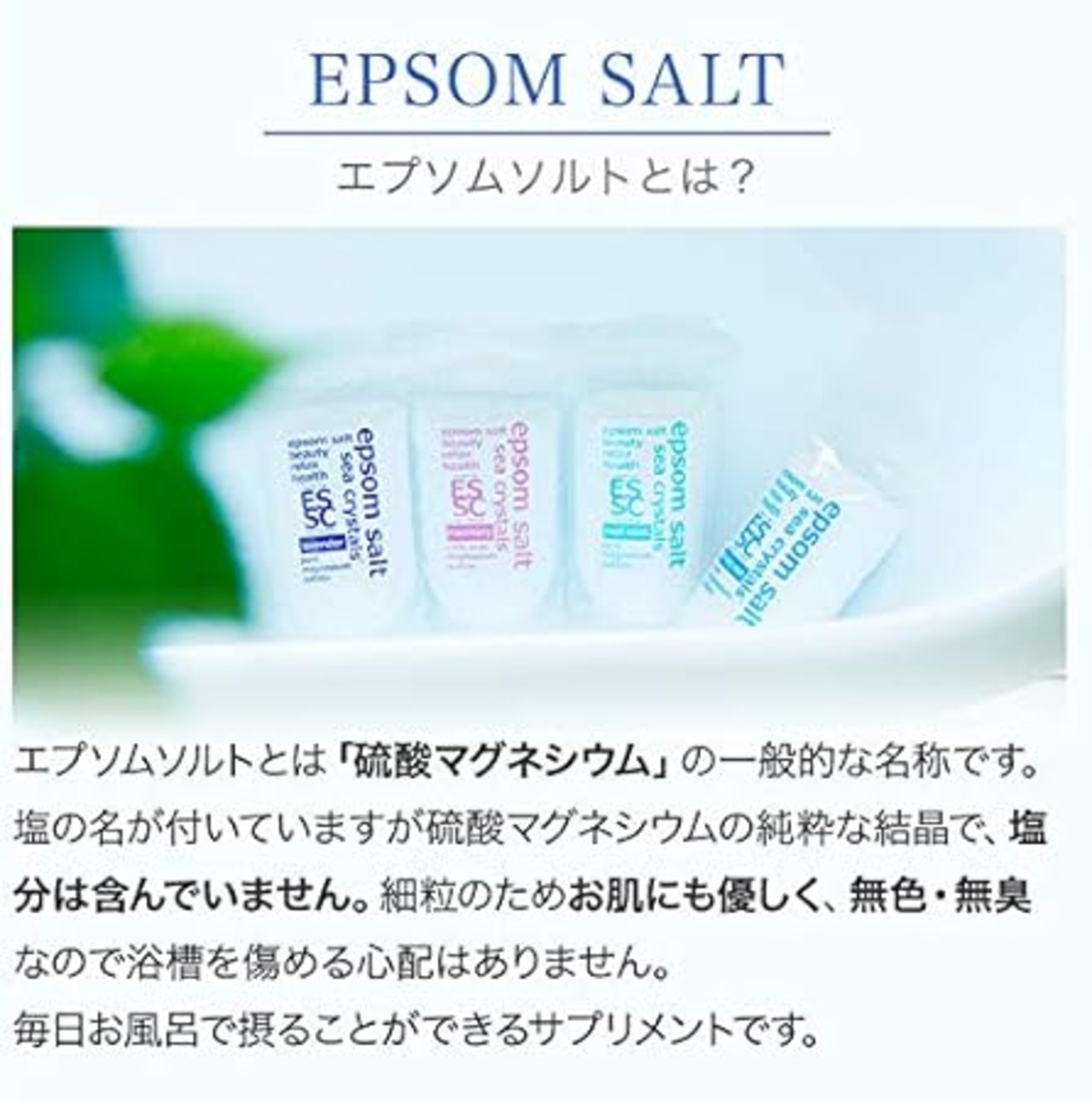 ・エプソムソルトとバスソルトの違い バスソルトは塩分 77.9%、海水比3% エプソムソルトは塩分0%、硫酸 マグネシウム99%、海水比0.2% 同じ量でマグネシウ ムミネラルは約4.5倍エプソムソルトが多くなります。