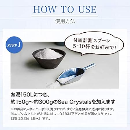 ・エプソムソルトの使い方は、150Lのお風呂に150cc以 上(0.1〜0.2%)入れてください。数秒でお湯が白く濁 りまた透明にもどり水道水の塩素は中和されます。ゆっ くり温まってください。入浴時間20分をお勧めします。