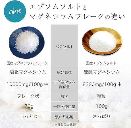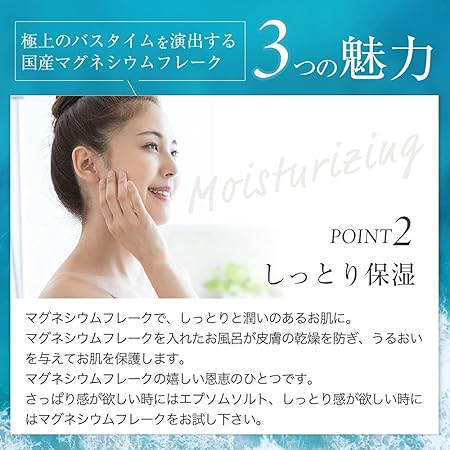 ・【マグネシウムフレークとは】海水に含まれるミネラルの一種で、正式名称は「塩化マグネシウム」。塩化マグネシウムは「にがり」の主成分でもあり、海水の塩分のうち9.6%がこの「塩化マグネシウム」にあたります。無添加で安心な自然派入浴剤として、お子様とご一緒のお風呂も安心してお楽しみいただけます