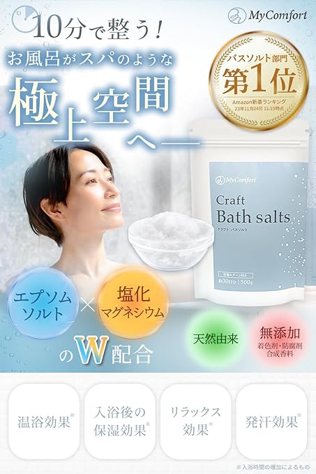 ・【選ばれる圧倒的な理由】不足しがちな必須ミネラル(エプソムソルト)とマグネシウムをW配合。エプソムソルトだけでは使用量が多い、すぐになくなる、発汗するのに時間がかかるなどの従来の悩みを解決。浸透圧の高い塩化マグネシウムを配合することで10分の1の量でも効果を実感できるようになりました。自然ミネラルでお肌に潤いを与え、入浴による発汗効果が期待できます。