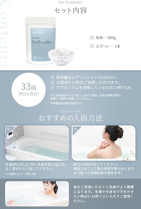 ・【ご使用方法】入浴時に浴槽へ付属のスプーン1.5杯を入れてください。(約15g)(冬場などの乾燥時期や保湿・保温を高めたい場合には5~10杯ほどお入れください。) その後、よく混ぜて溶かします。追い焚き循環式や24時間風呂でも使用でき、残り湯を洗濯にもお使い頂けます。 国産100%、国内のバスソルト製造会社と共同開発なので安心、安全にご利用いただけます。