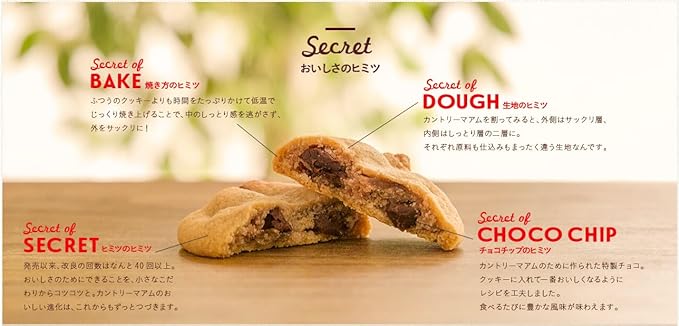 ・さらに美味しさアップ!外はさっくり、中はしっとり。あなたのそばに、そっと優しく寄り添う。カントリーマアムが目指したのは、ちょうど、焼きたてクッキーのような美味しさです。