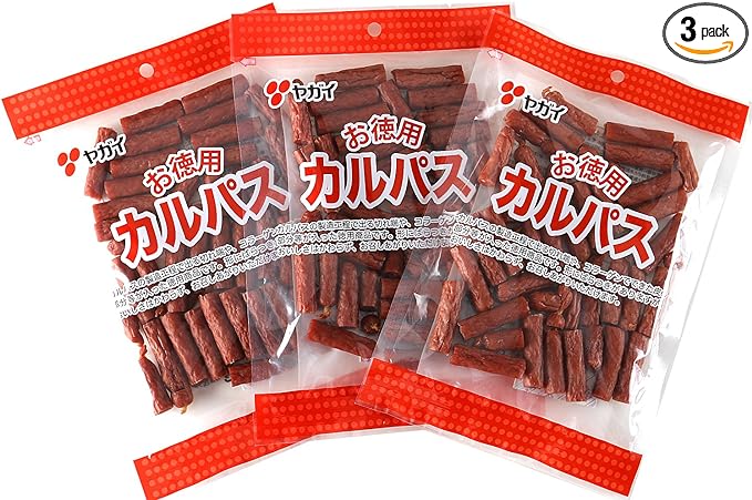 カルパスの製造工程で出る切れ端や、コラーゲンでできた皮の部分等が入った徳用商品です。形にばらつきがありますが、おいしさはかわらず、お召しあがりいただけます。