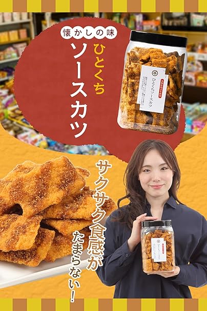 ・【ひとくちサイズで食べたい分だけ】パクパクと気軽に食べられるひとくちサイズ。サクサクとした食感が楽しめ、食べ始めると止まらなくなってしまう美味しさです。普段食べるスナック菓子のように身近で、オタフクソースを使用し本格的なソースカツのような味わいが楽しめる駄菓子です。お子様のお菓子として、ビールやお酒のおつまみとしても相性抜群です。