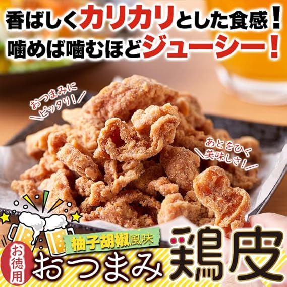 ・【国産の鶏皮使用!!】国産鶏皮に米粉をまぶして揚げた爽やかな柚子こしょうの風味がクセになるおつまみです!!