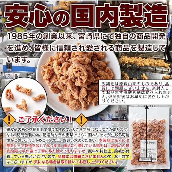 ・■品名:おつまみ鶏皮柚子胡椒風味 ■名称:鶏皮のからあげ ■原材料名:鶏皮(国産)、米粉、植物油脂、柚子胡椒風味シーズニング(食塩、香辛料、デキストリン、砂糖、柚子パウダー、レモン果汁パウダー)、食塩/調味料(アミノ酸等)、香料、リン酸三カルシウム、酸味料 ■内容量:200g ■賞味期限:製造日より常温180日 ■保存方法:直射日光、高温多湿を避けて保存してください。 本品原材料に含まれているアレルギー物質(28品目中)鶏肉 ※鶏毛は原料由来のものであり、品質には問題ございません。 ※封入しております脱酸素剤は食べられません。 ※開封後はお早めにお召し上がりください。 ※本品は特定原材料中、えび、かに、くるみ、小麦、そば、卵、乳成分、落花生を使用した設備で製造しています。