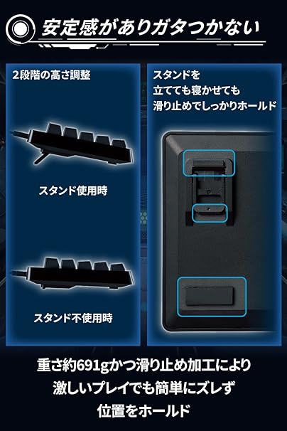 ■ コンパクト配列のキーボードでは省略されやすいESCキーなどのゲーム中の操作頻度が高いキーや、スクリーンショット撮影のPrintScreenキー、観戦中に便利なPageUpキー、PageDownキーを搭載しています。