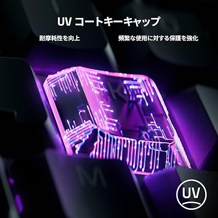 ・【UV コートキーキャップ】 UVコーティングによりキーキャップが強化され、一般的なキーキャップの7倍の耐久性を誇り、キートップの印字の文字消えを確実に防ぎ、頻繁な使用による摩耗からも保護します。さらに、タクタイル感に優れたテクスチャ仕上げを採用しています。