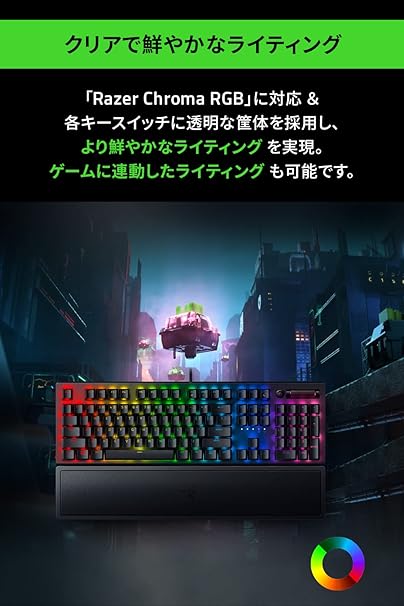 ・【透明なスイッチハウジング】 透明なスイッチハウジングを搭載することにより、rgb ライティングの明度を高めて、razer chroma rgb の素晴らしい機能を表現するのに最適です。高度なライティングのカスタマイズ機能に加え、150 以上の対応ゲームに合わせたダイナミックな反応により優れた没入感が楽しめます。