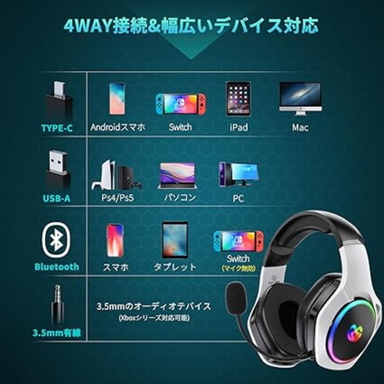 ・【日本初・Tatybo自社開発の4WAY接続】?@ 2.4GHz TYPE-Cワイヤレスレシーバー接続:スマートフォン、iPad、Mac、Switch。?A2.4GHz USB-Aワイヤレスレシーバー接続:Ps5、Ps4、パソコン、Mac、PC。?BBluetooth 5.3接続:スマートフォン、ipad、Laptop、Switch。?C 3.5MM有線接続:(3.5mmのオ一ディオテバイス)Ps5/4、Switch、PCなど。ケーブルが断線したり、引っかかってしまったりしないワイヤレスタイプ「2.4GHzドングル式とBluetooth接続」。弊社の有線 無線両用 ヘッドセットがケーブルのわずらわしさや可動域を気にせず快適にプレイできますさまざまな機器に使いやすい3.5mm有線接続も可能なので汎用性の高さが魅力です。