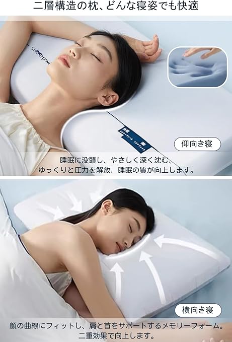・【ぐっすり眠れる枕】2層構造の枕で自分に合った快適な寝心地を追求できます。この枕は柔軟性とサポート力を兼ね備え、体の曲線にやさしくフィットし、体圧を分散して負担を軽減します。同時に、身体の重みをしっかりと支え、睡眠中の適切な寝姿勢を維持し、快適な睡眠をサポートします。