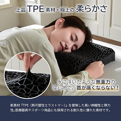 ・【首が痛くならない 枕】高反発と低反発の利点を兼ね備え、ゴムのように伸縮するTPEゲル素材で頭部を優しく包み込みます。スムーズな寝返りをサポートする快眠枕です。