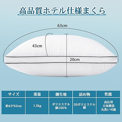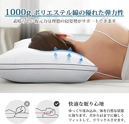 ・【高反発-復元力を持ち】1000gの3Dポリエステル素材をボリュームたっぷりに詰め込み、羽毛相当の柔らかさを持つ同時にふっくらとした復元力を実現します。寝ている間、首の位置を自然な状態に保ちます。ゆっくりと沈み込み、頭の形に優しくぴったりフィットします。どのような寝返りをうっても頭や首を安定させてくれます。横向き寝・仰向け寝・うつ伏せ寝、お好きな寝姿でぐっすり眠れます。