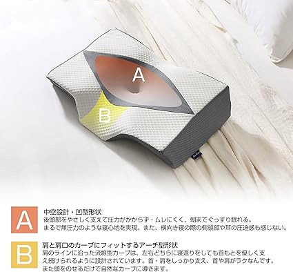 ・【凹型の中空設計】日本人の体型に基づいて設計された低反発枕です。凹型の中空設計により、頭が安定し、頭部への負担をかけず、まるで無圧力のような寝心地を実現。横向き寝の際の側頭部や耳のあっぱく感も感じない。肩と肩口のカーブにフィットするアーチ型形状で頭をのせるだけで自然なカーブに導き、首や肩もラクなんです。