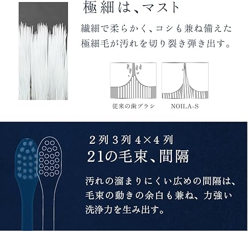 ・【4倍長持ち Durability】 耐久性に優れたテーパー毛使用により、新品の歯ブラシのような毛の状態が長続き。一般的なナイロン製の歯ブラシに比べ、テーパー毛を使用するNOILAの歯ブラシは4倍も耐久性に優れています。つまり、毛が開きにくく、買ったばかりの歯磨きのように歯に接地して磨けていない状態を防ぎます。
