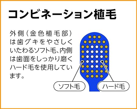 外側(金色植毛部)は歯ぐきをやさしくいたわるソフト毛、内側は歯面をしっかり磨くハード毛を使用しています。幅広ヘッドタイプは5種類