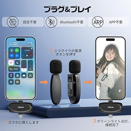 ・【操作簡単&二つマイク】APPやBluetooth、インストール不要、直接挿すだけで自動的に接続され、全方向から高音質に人の声を収集&録音でき便利なワイヤレスマイクです。マイクが2枚あるので、家族や友達と一緒にビデオ撮影を楽しむことができます。マイクを単独で使用することもできます。ご注意:本商品は、アンプやスピーカーなどとしては使用できません。音声収集、録音機能のみ対応しております。