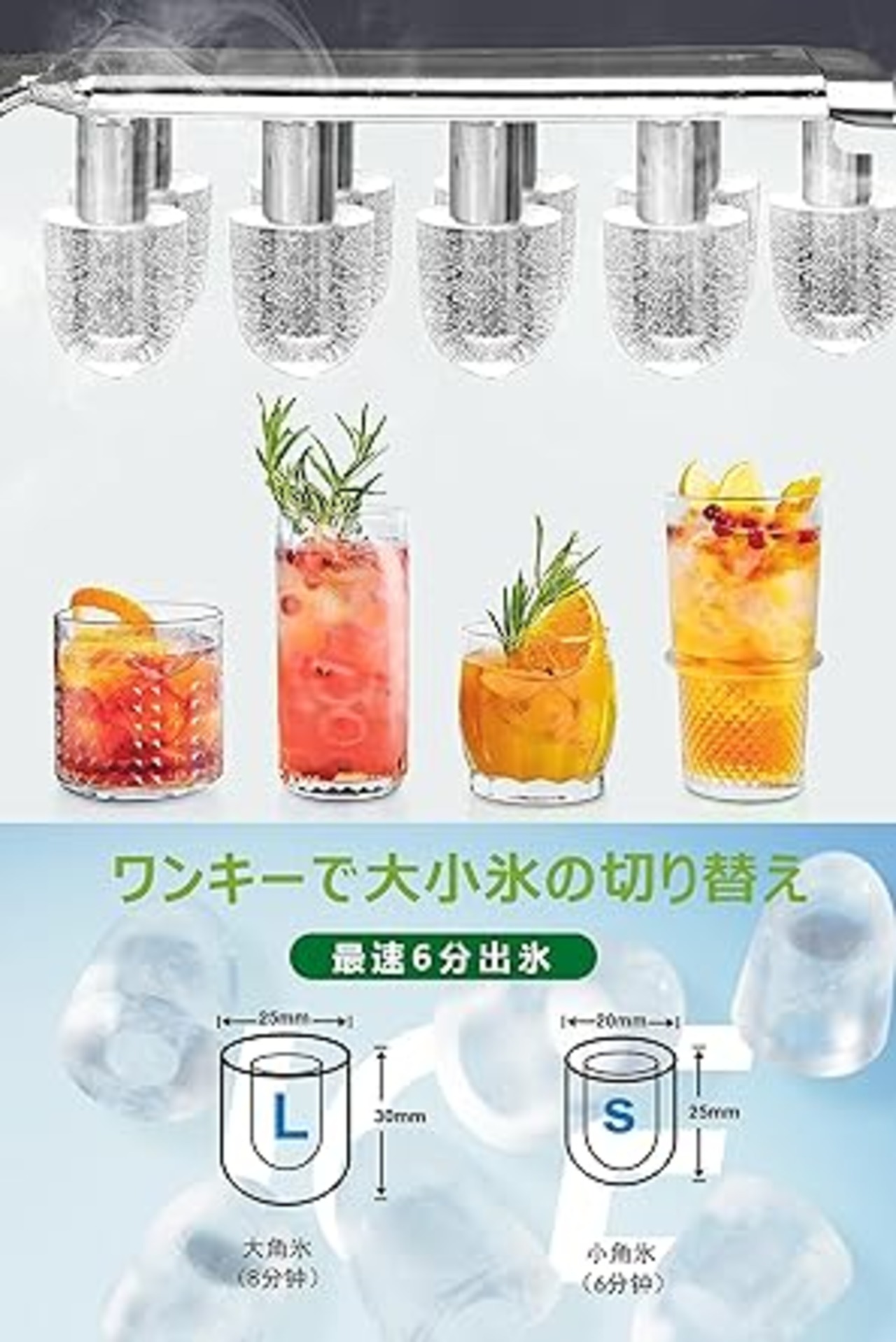 ・【角氷サイズ調整の可能性】Pokzon家庭用製氷機は2つの氷サイズが生産できます。最速の6分氷(小氷)、細いボトルにも入りやすい小氷、大きな氷(8分氷)は液体を素早く冷やしゆっくり溶けるので、飲み物(ジュース、コーヒー、ビール)などに幅広く使えます。ポクゾンアイスメーカーは、サプライズゲストや家族の集まりのために事前に角氷を作り、わずか6分で9個の蓋型氷を作ります。専用のアイススクープと水を加えるための容量カップが付属しており、水を加えたり、氷を取り除くのに非常に便利です。製氷機の水タンク容量は1.6Lで、1日約15kgの氷を作ることができます。