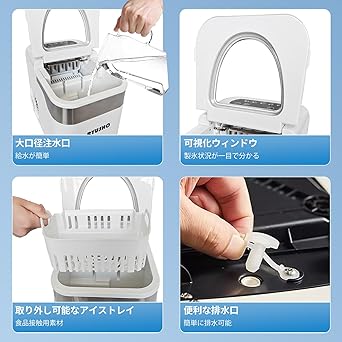 ・【高品質な素材と健康・安全性】製氷機家庭用は高品質の食品グレードABS素材を採用し、耐久性と清潔さを兼ね備えた精巧なデザインです。食品グレードの素材で作られた氷は健康と安全を確保します。透明な大窓から内部の製氷状況を簡単に確認できます。取り外し可能な氷バスケットとアイススコップが付属し、飲み物に氷を移すのが便利です。環境温度と大/小の氷のモードに応じて製氷時間を自動的に調整します。最初の水温が高いため、初回4回の製氷は形が小さくなりますが、水タンクの温度が低くなると製氷効果が向上します。1年間の保証サービスを提供しており、問題があればいつでもお問い合わせください。