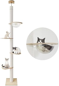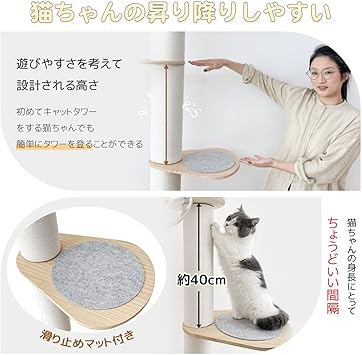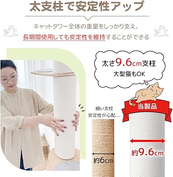 ・ホワイトコットン素材:ポールはホワイトコットン素材で包まれており、臭いやホコリの心配はありません。猫ちゃんが爪とぎをするのに最適で、家具や壁の破壊を防ぐ役割も果たします。色合いも魅力的で、部屋にも馴染みやすく、インテリアとして素晴らしいです。