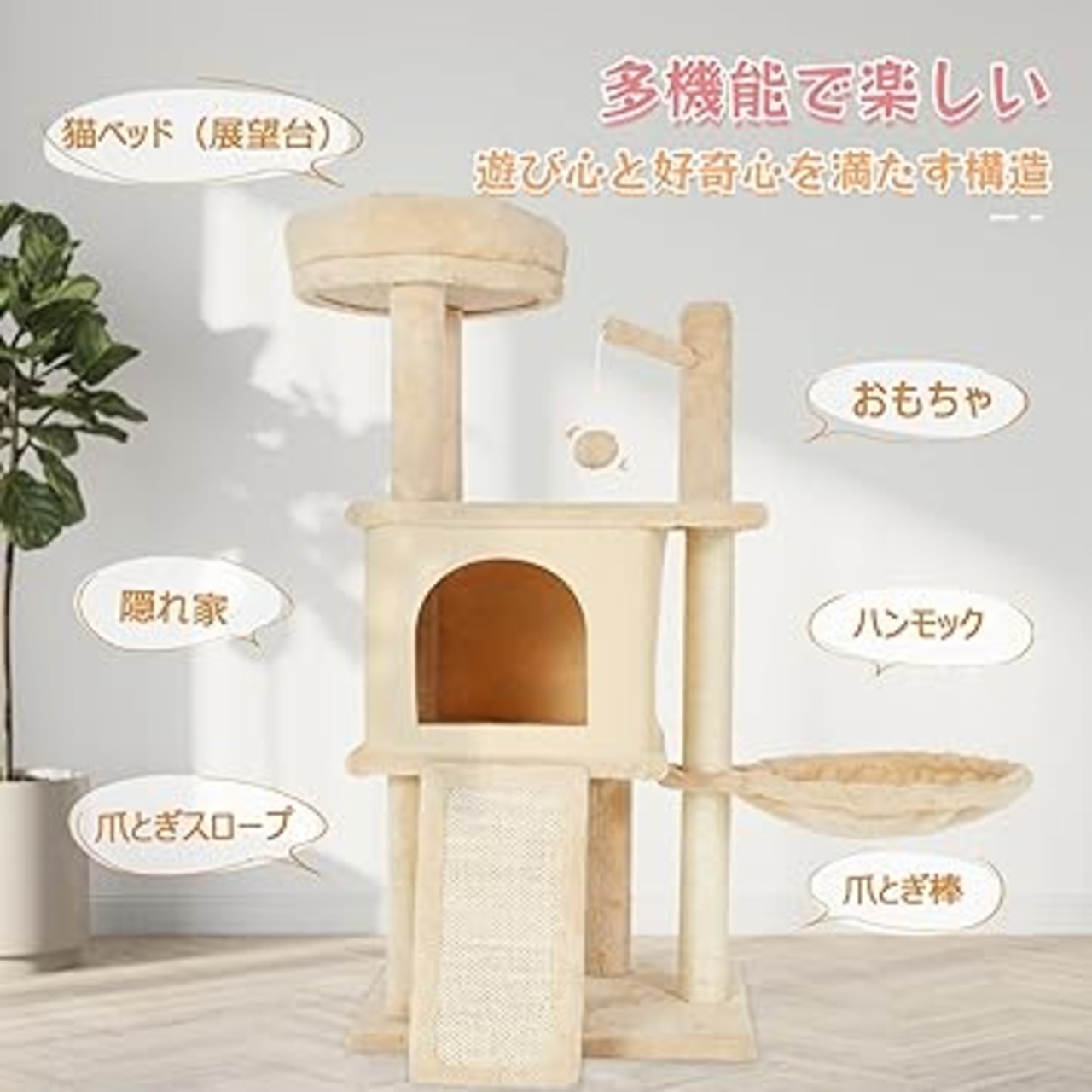 ・【猫が大好きな要素満載】高台?猫ハウス?ハンモック?ボンボンおもちゃ?爪とぎ棒?爪とぎ板などが充実!猫ちゃんの好みに合わせて多彩な要素を用意しています。上り下りしやすいジャンプしたり遊んだりと自由自在に楽しめます。運動不足解消に最適