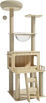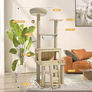 ・【多機能設計】お休みができる大きい隠れ家、複数の宇宙船、広いジャンプ台、見晴らしのよい高台、複数の高耐久性爪とぎポール、遊び放題の幅広い台座などを取り付きました。娯楽、運動、休みを集めの遊び場としてピッタリの室内用猫タワーです。透明度の高いアクリル製ボウル型宇宙船、360°から愛猫が様々な遊び姿が見える。