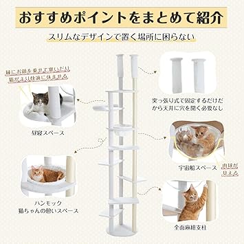 キャットタワー 突っ張り スリム 省スペース 猫タワー 突っ張り スリム 大型猫用 多頭飼い 6本天然サイザル麻紐 爪とぎ キャットツリ 見