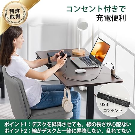 ・【コンセント・USBポート付きで、充電楽々】1つのUSBポートと2つのコンセント付き、充電が手軽に行えます。パソコンデスクが昇降しても、コードが短くコンセントに届かない問題が発生しません。さらに、スライドカバーは使用しないときに自動的に閉じるので、防塵や防水対策になります。