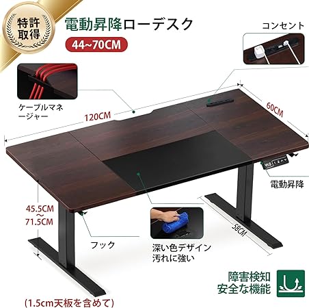 ・【特許取得の人気で革新的な昇降ローデスク】高さ45.5〜71.5cm(1.5cm天板を含めて)昇降、日本人に合った電動昇降式ローデスクです。座椅子、レーシングシミュレーター、ソファー、デスクチェア、ベッドなど、さまざまな座席に対応しています。また、子供の成長に合わせて高さを調整できます。ツートーンカラーデザインの天板は、作業エリアを際立たせ、汚れにも強く、手入れも簡単です。