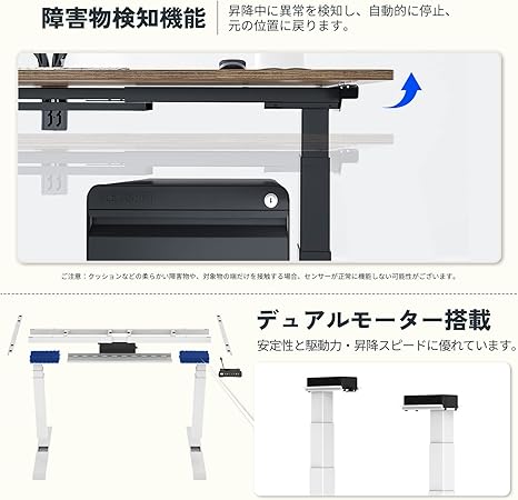 ・【セーフティモーション(障害物検知機能)】昇降時に障害物を検知するセンサーが内蔵されており、異物にぶつかったら自動的に操作を停止してもとの位置に戻ります。この機能は敏感度が三段階調節することができます。