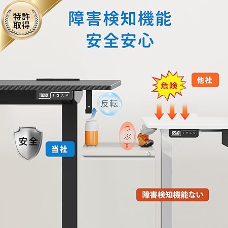 ・【強力なドライブ - スムーズな昇降】効率的な電動システムにより、静かで安定した昇降が可能です。作業中も集中しやすく、そのため全体的な作業効率が向上します。最大負荷時でも音量は48デシベル以下で、安定性を維持します。【使いやすい電動昇降コントロール】ボタンは4つしかなく、複雑ではありません。上下の矢印ボタンを押し続けると、昇降できます。1を押すとデスクが自動的に下降し、2を押すと自動的に上昇します。