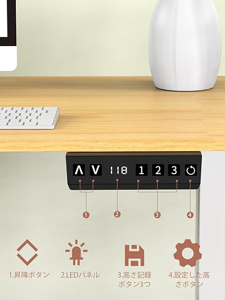 ・1cmまでの微調整が可能:従来の 昇降デスク に比べ、この 電動昇降デスク は最低1cm単位の高さ調整ができるように設計されています。これにより、特定の範囲内(71~117cm)で高さを柔軟にカスタマイズすることが実現。
